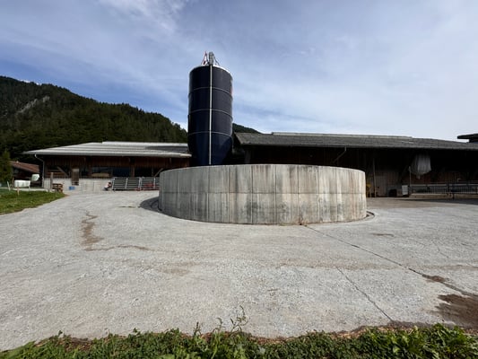 Ganz anders präsentiert sich der Aufzuchtbetrieb von Armin & Edith Mark. Der Hochsilo mit Schweizerfahne und die Scheune mit Wohnhaus prägen das Landschaftsbild mit dem gepflegten Hofplatz und den sauberen, ruhigen Tieren.